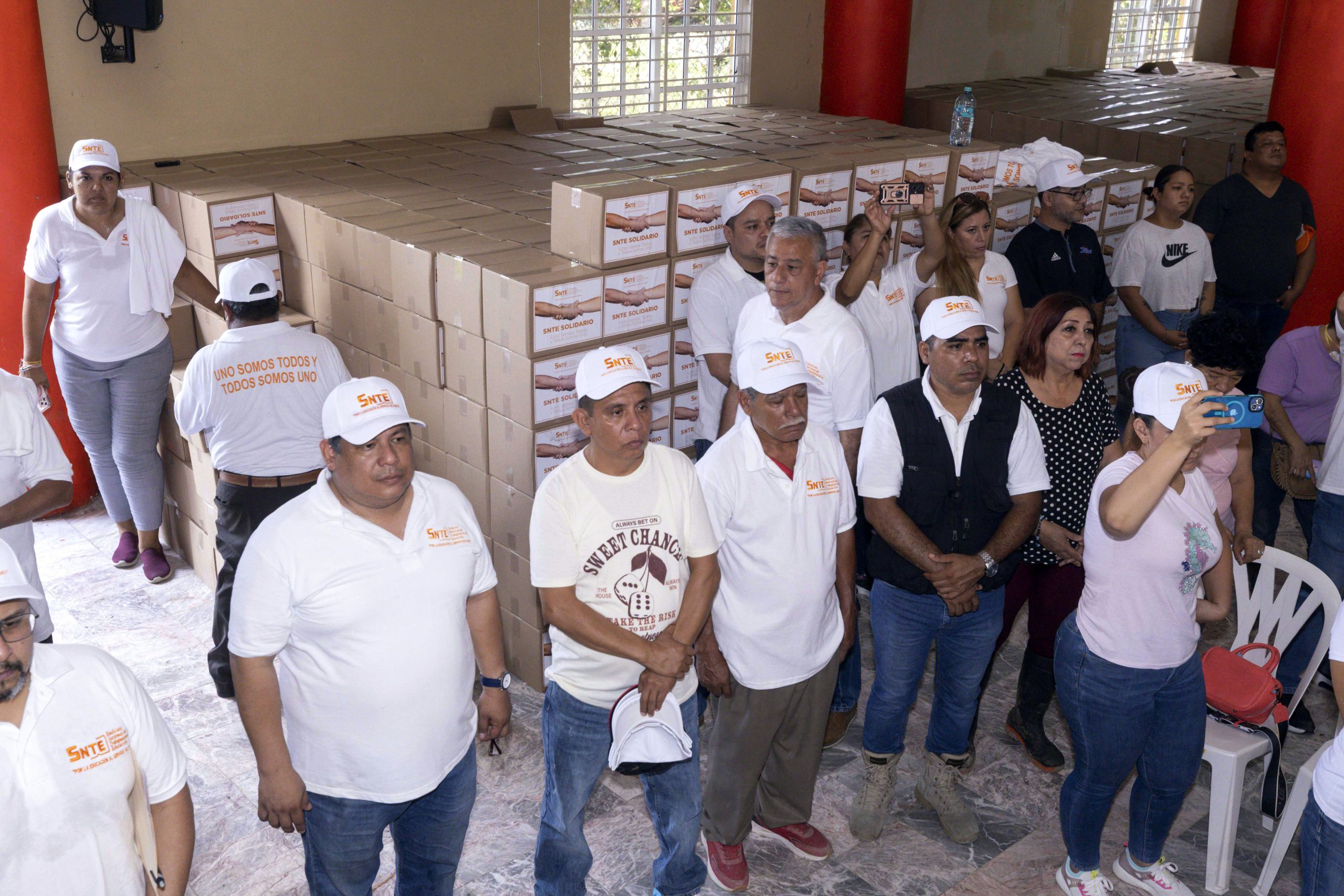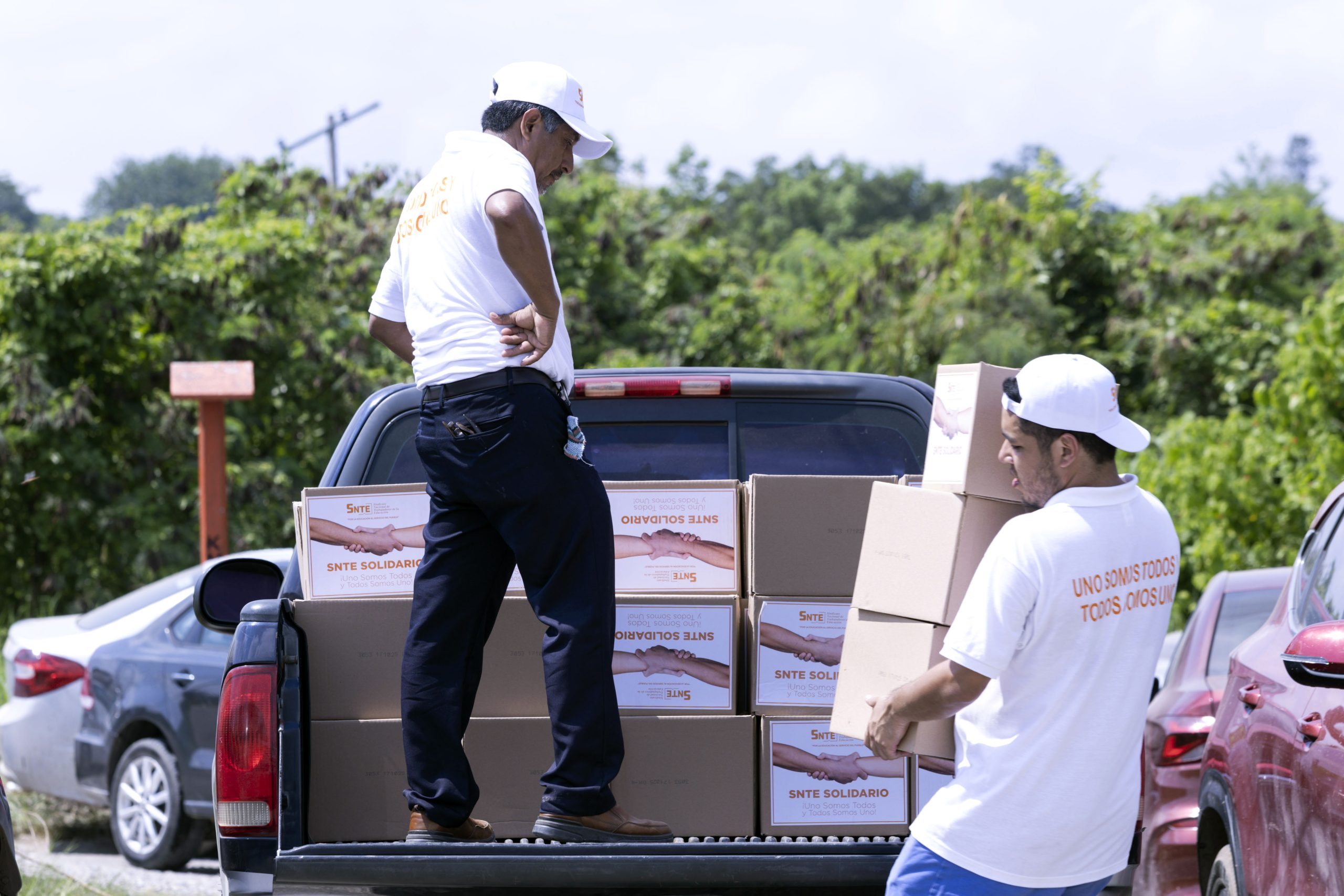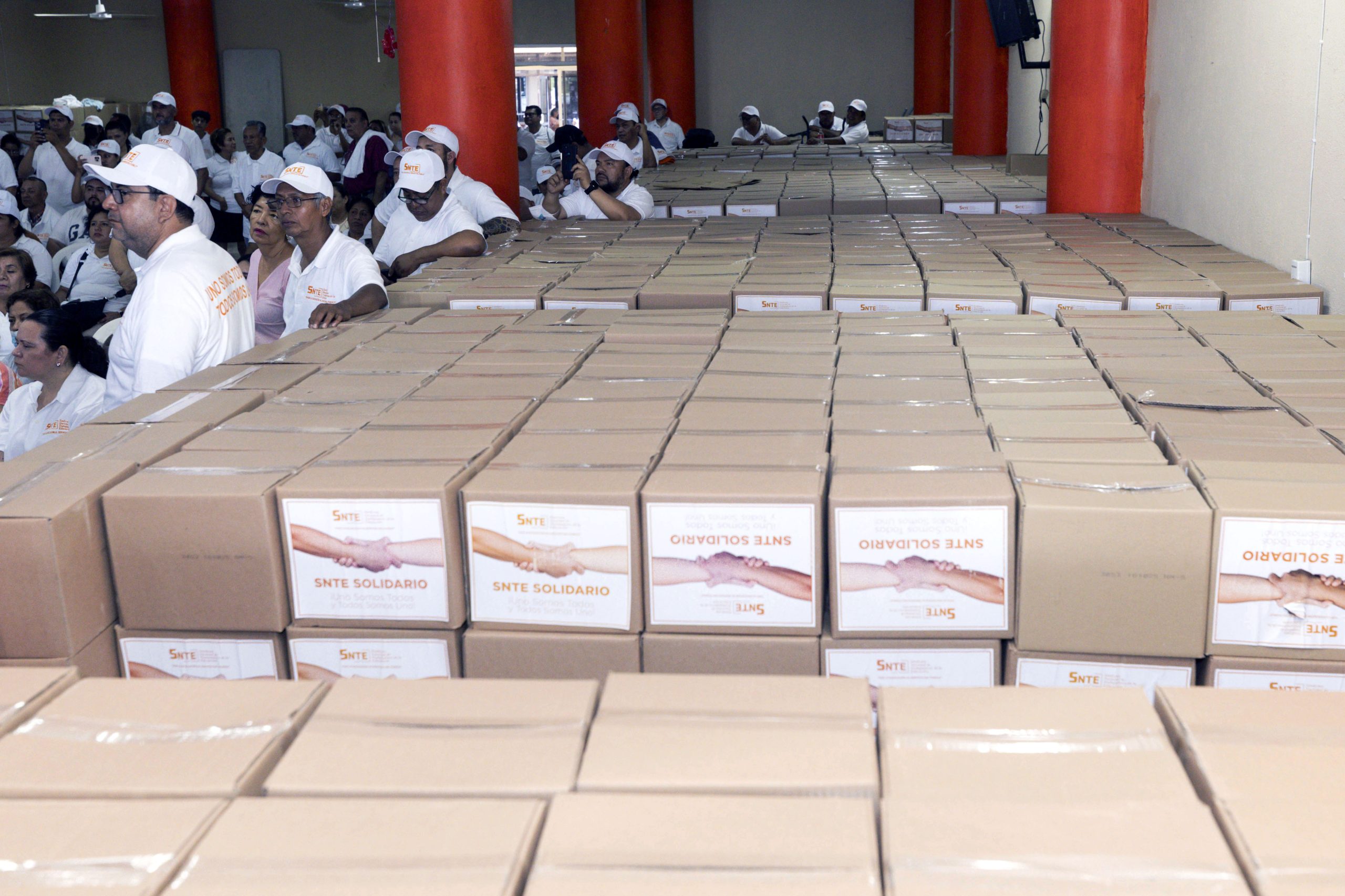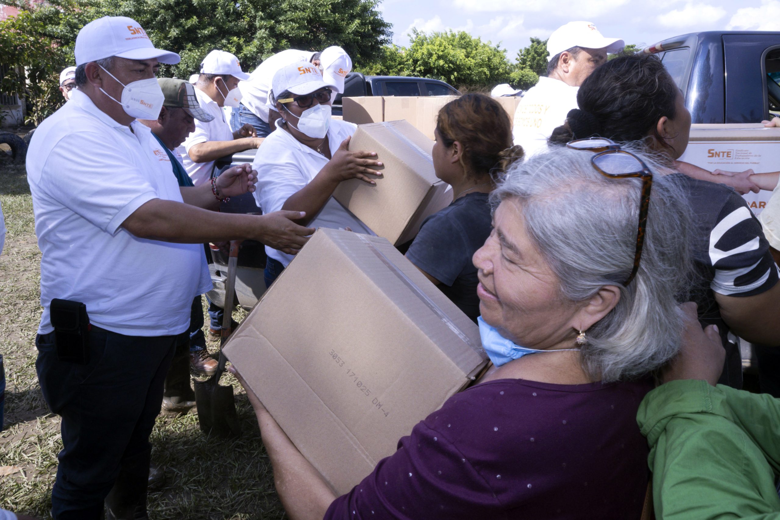 Este fin de semana, el secretario general del Sindicato Nacional de Trabajadores de la Educación (SNTE), maestro Alfonso Cepeda Salas, coordinó los trabajos de distribución en Poza Rica, Veracruz, mientras continúa la recepción de ayuda en los 106 centros de acopio habilitados.