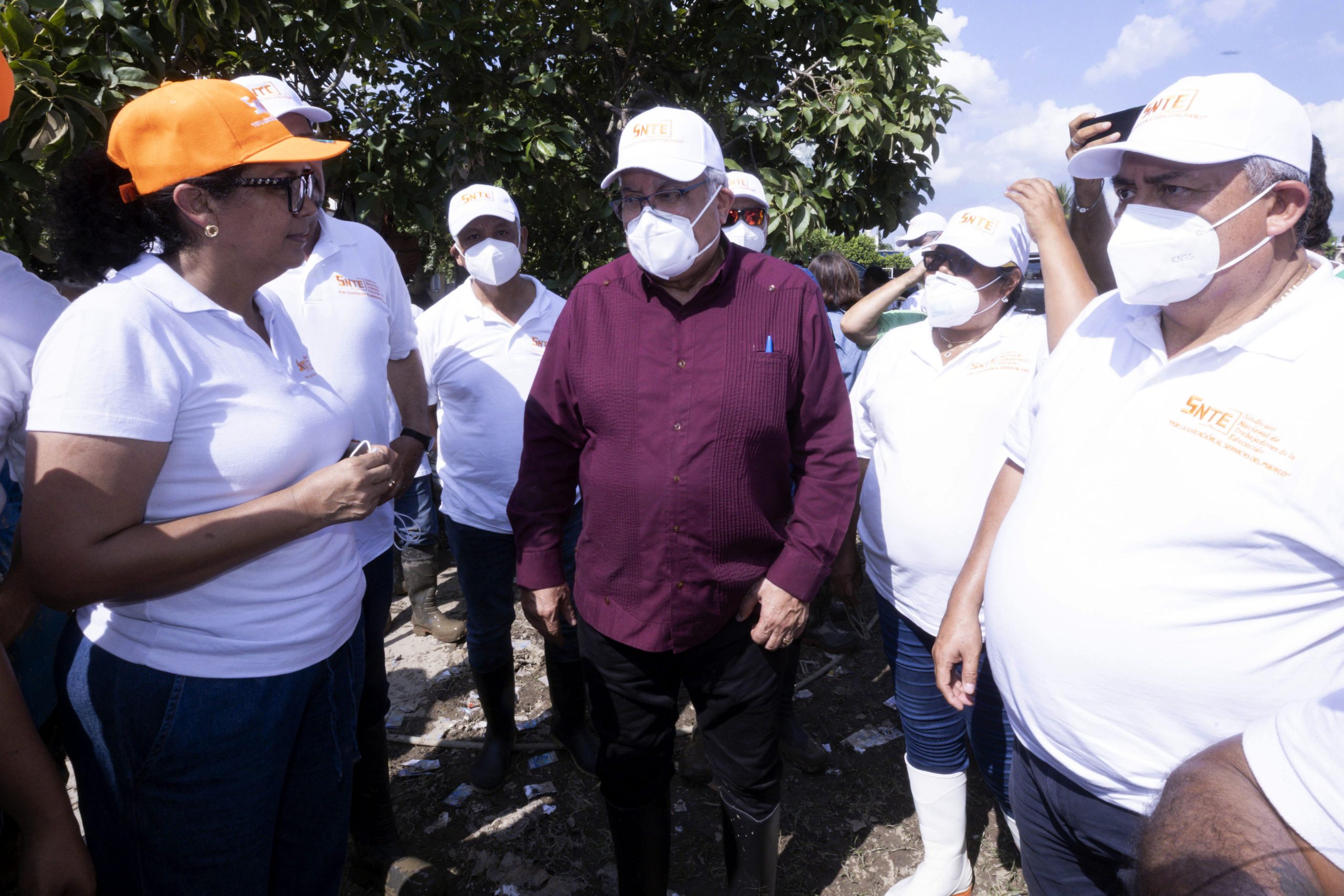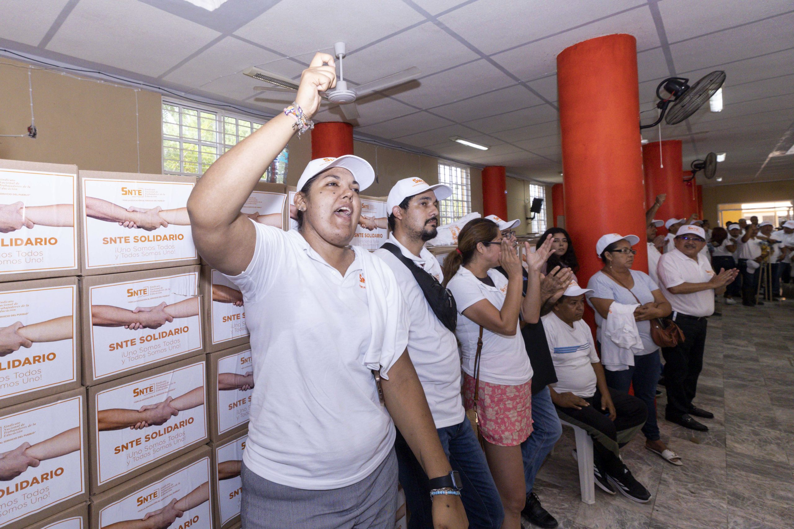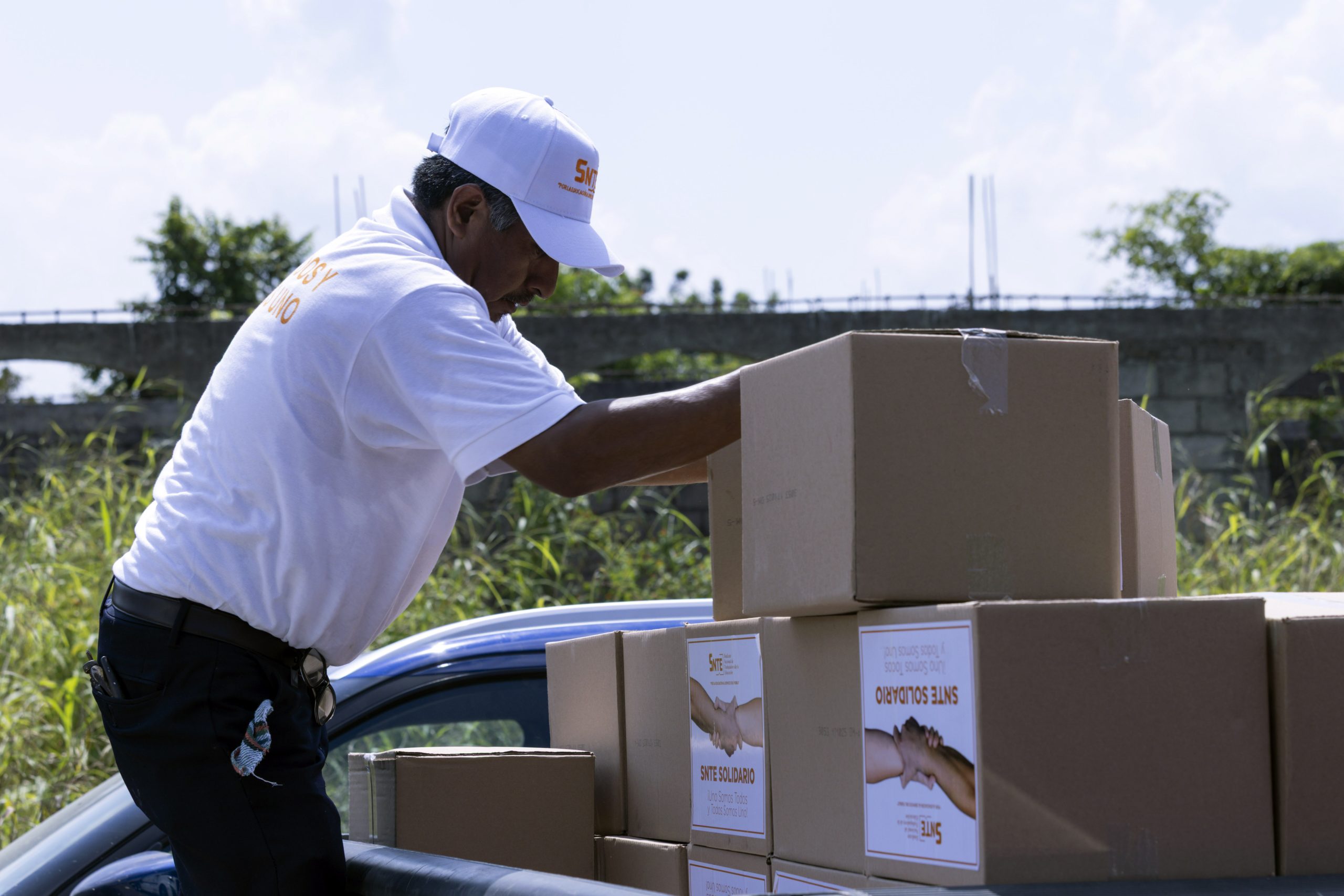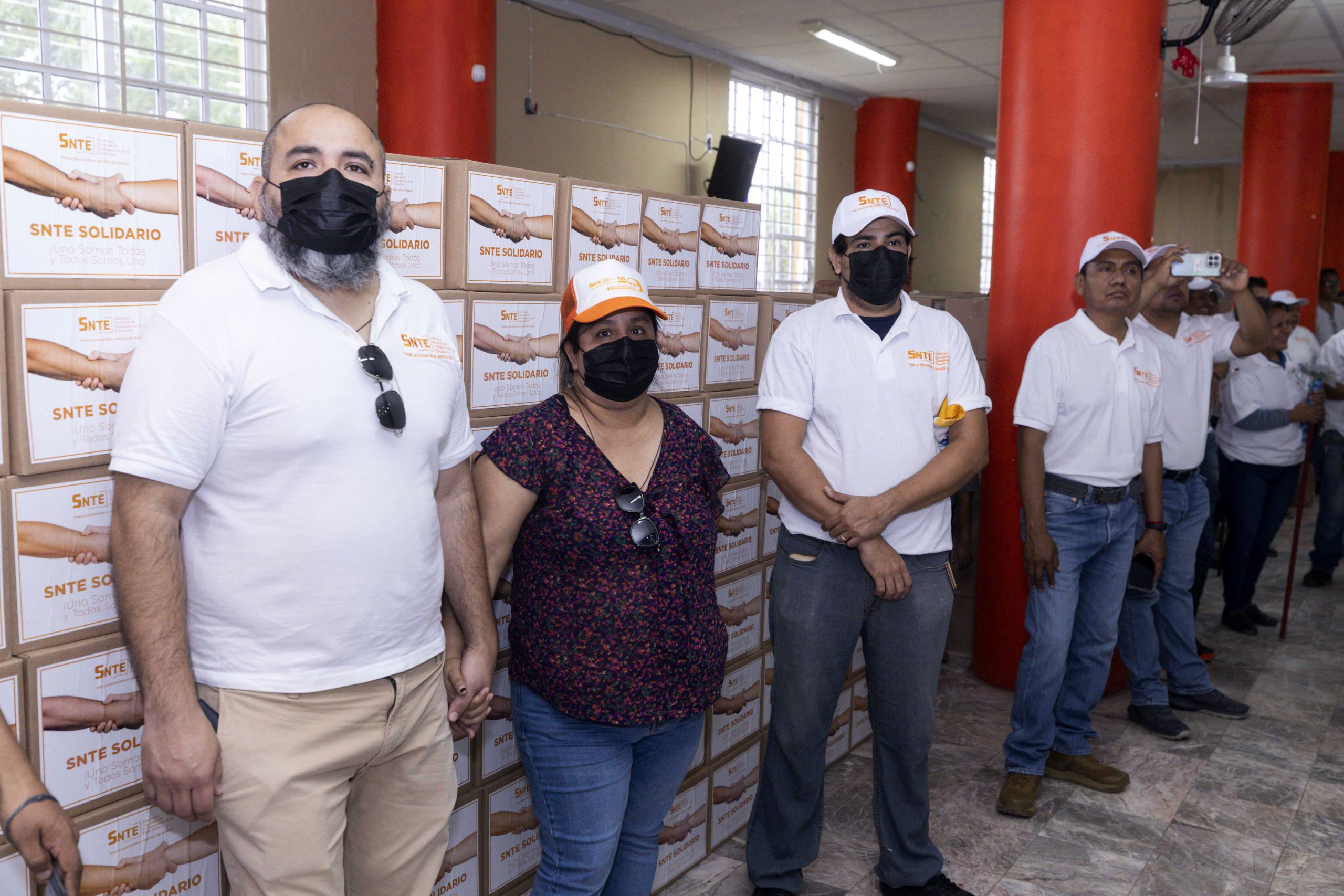 Este fin de semana, el secretario general del Sindicato Nacional de Trabajadores de la Educación (SNTE), maestro Alfonso Cepeda Salas, coordinó los trabajos de distribución en Poza Rica, Veracruz, mientras continúa la recepción de ayuda en los 106 centros de acopio habilitados.