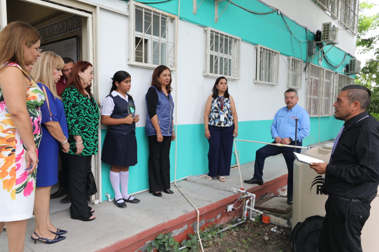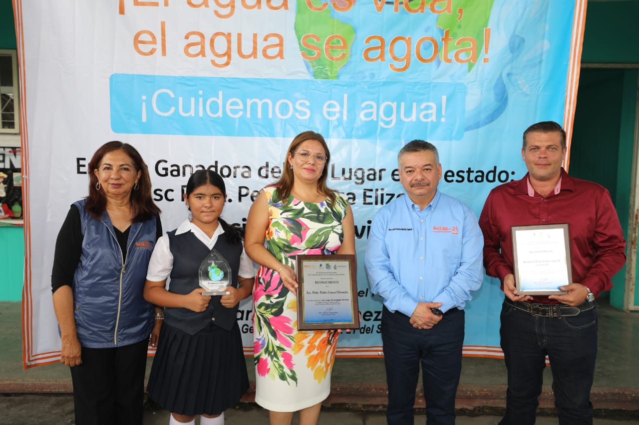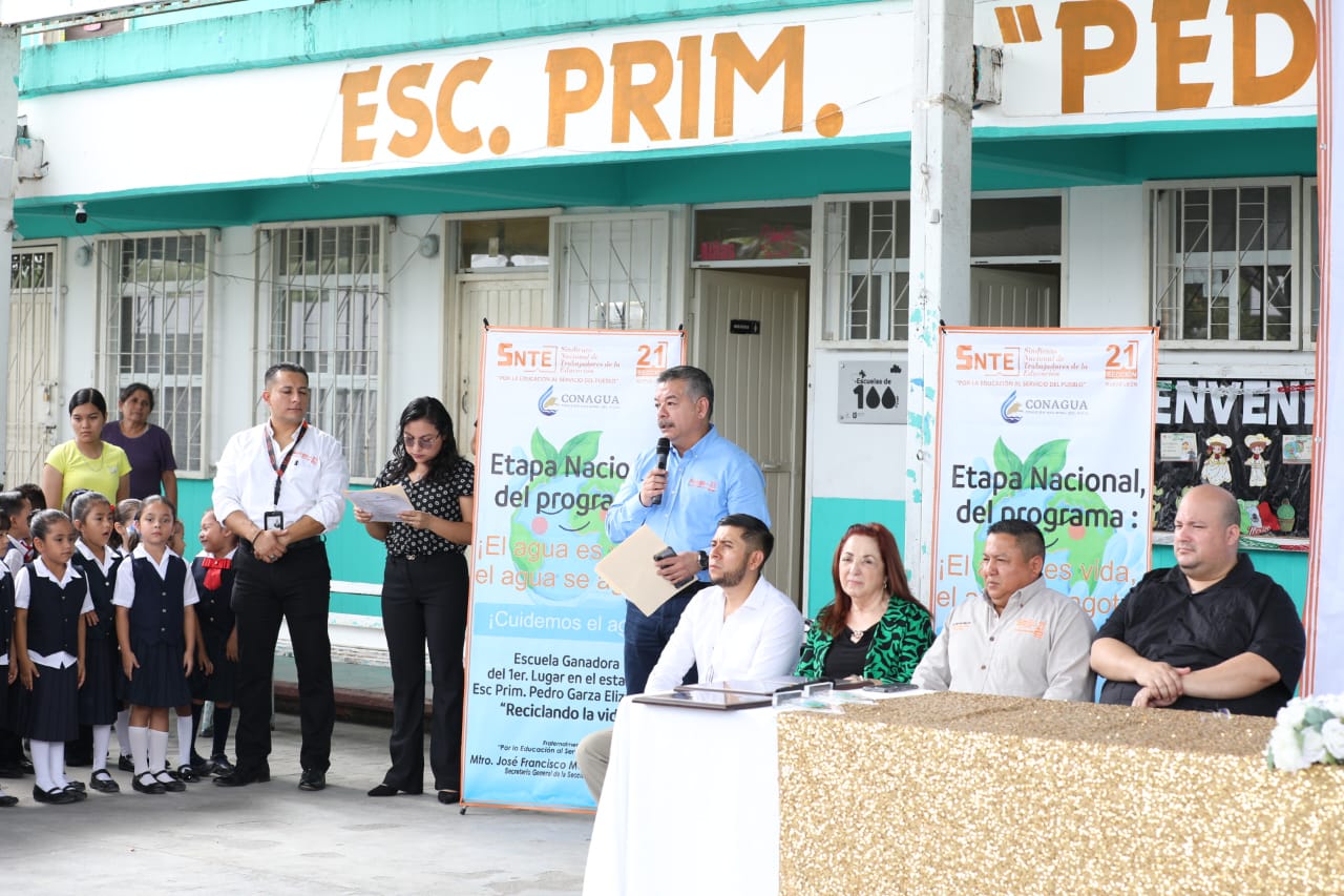 El Secretario General de la Sección 21 del Sindicato Nacional de Trabajadores de la Educación, Maestro José Francisco Martínez Calderón, acompañado de la Representante personal del Mtro. Alfonso Cepeda Salas en la Sección 21, la Mtra. Elsa María Martínez Peña, visitaron la Escuela Primaria “Pedro Garza Elizondo” del municipio de Ciudad Benito Juárez, que dirige la Profa. Mayela Edith Rodríguez Rocha, para entregarles su reconocimiento como ganadores del primer lugar nacional del certamen “El Agua es Vida, el Agua se Agota”, organizado por el SNTE, con su proyecto “Reciclando Vida”.