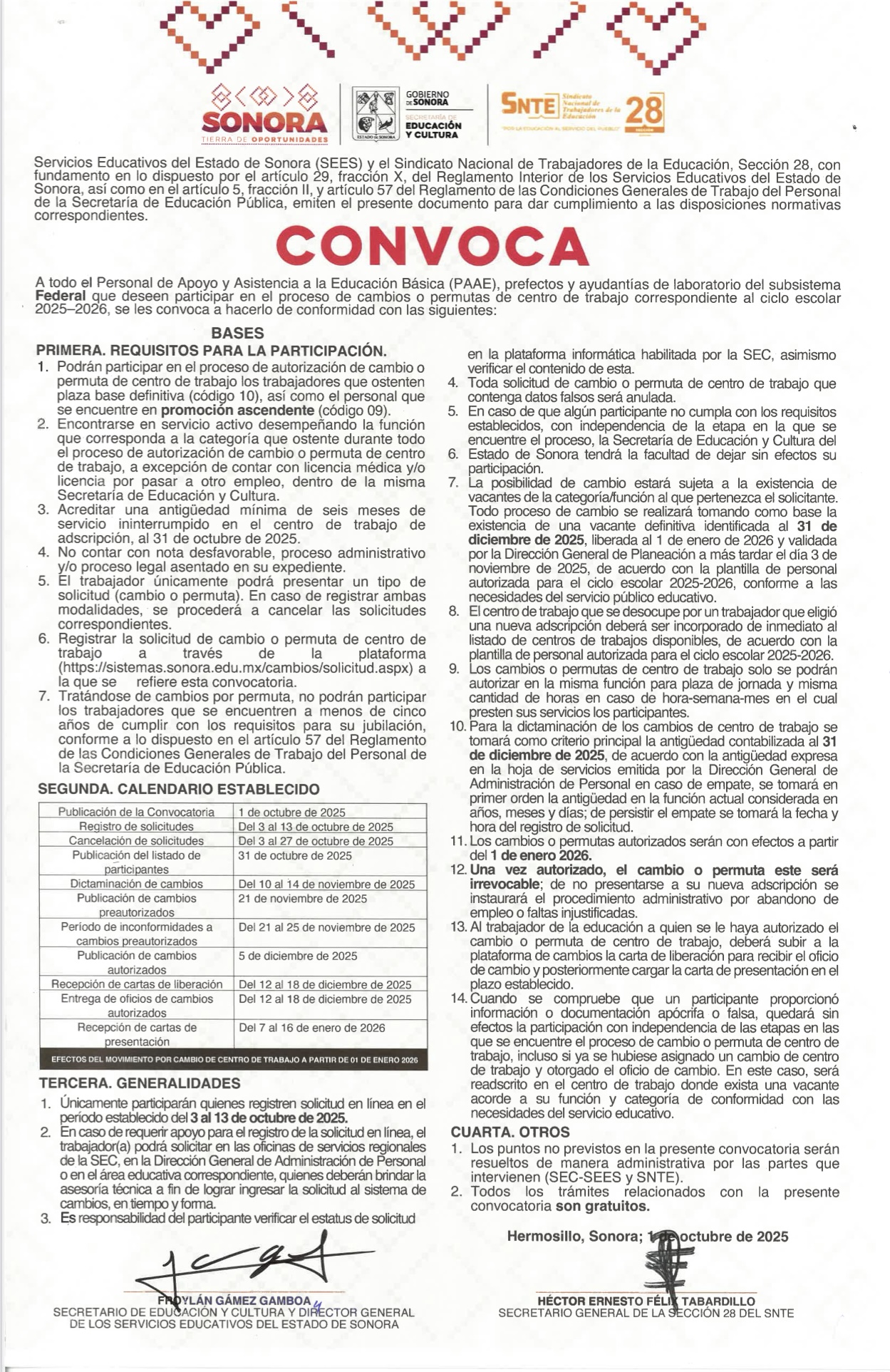 A todo el Personal de Apoyo y Asistencia a la Educación Básica (PAAE), prefectos y ayudantías de laboratorio agremiados a la Sección 28 del SNTE que deseen participar en el proceso de cambios o permutas de centro de trabajo correspondiente al ciclo escolar 2025-2026, se les convoca a hacerlo.