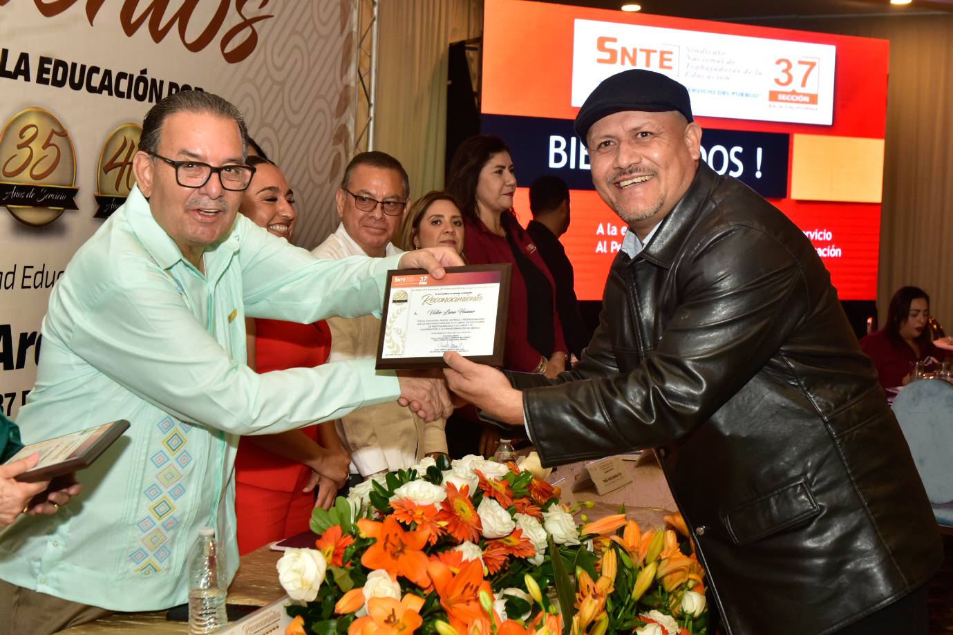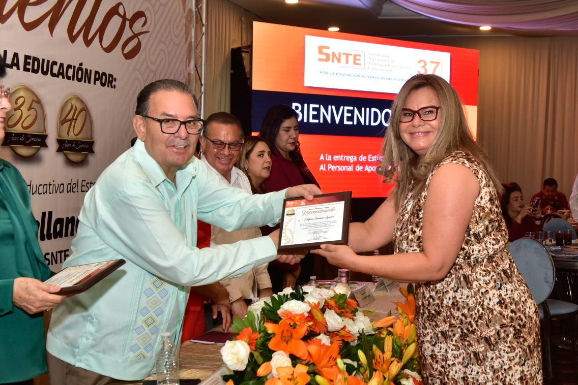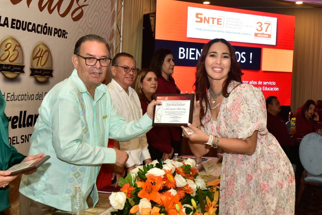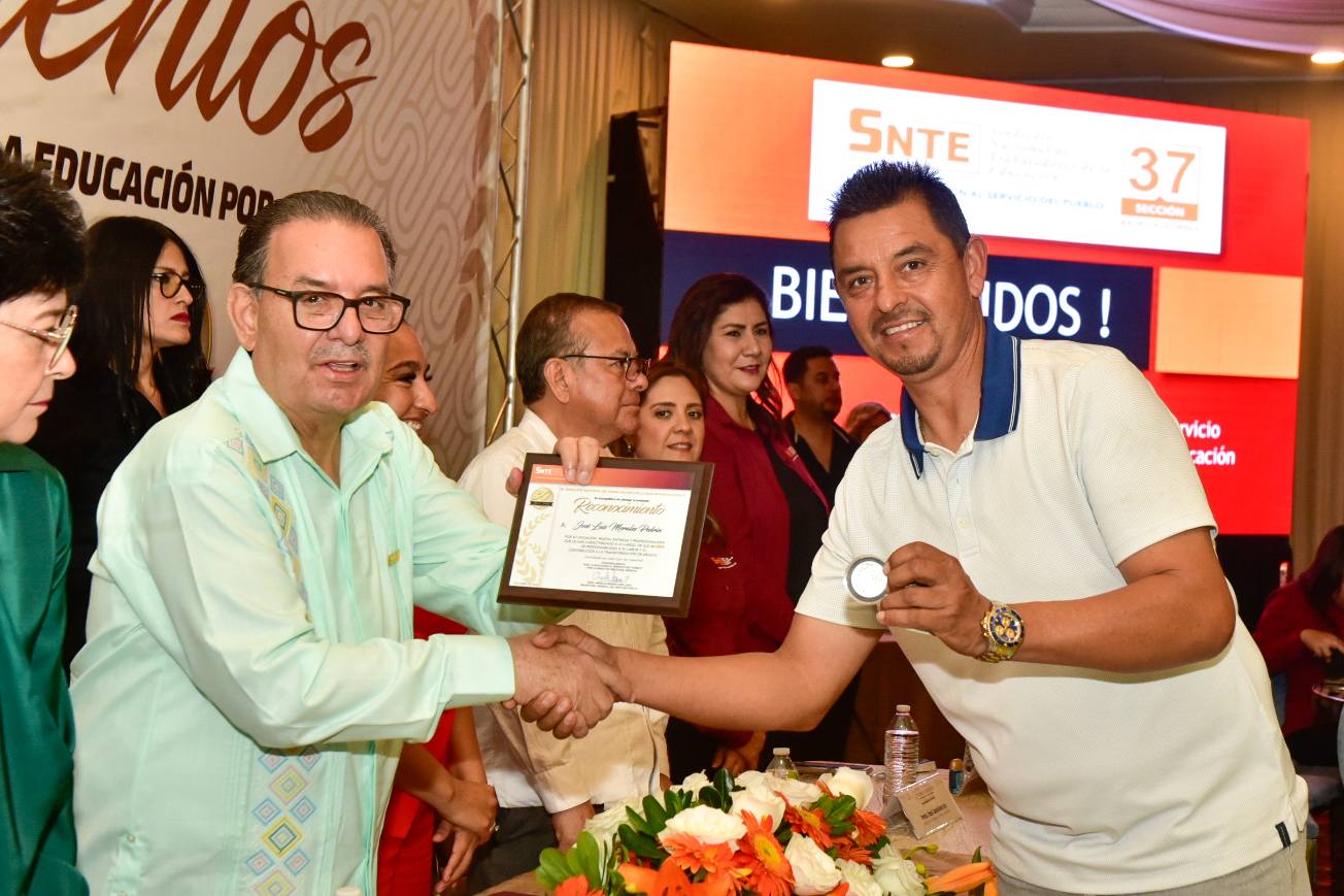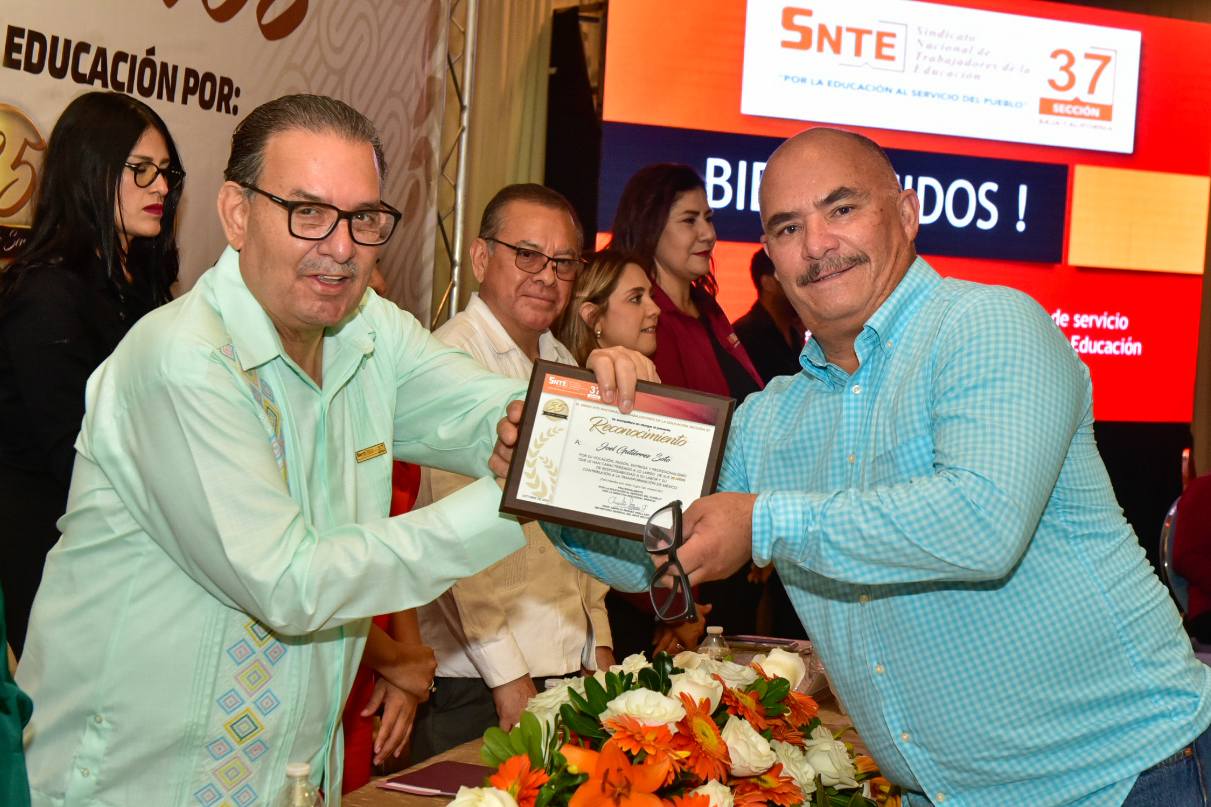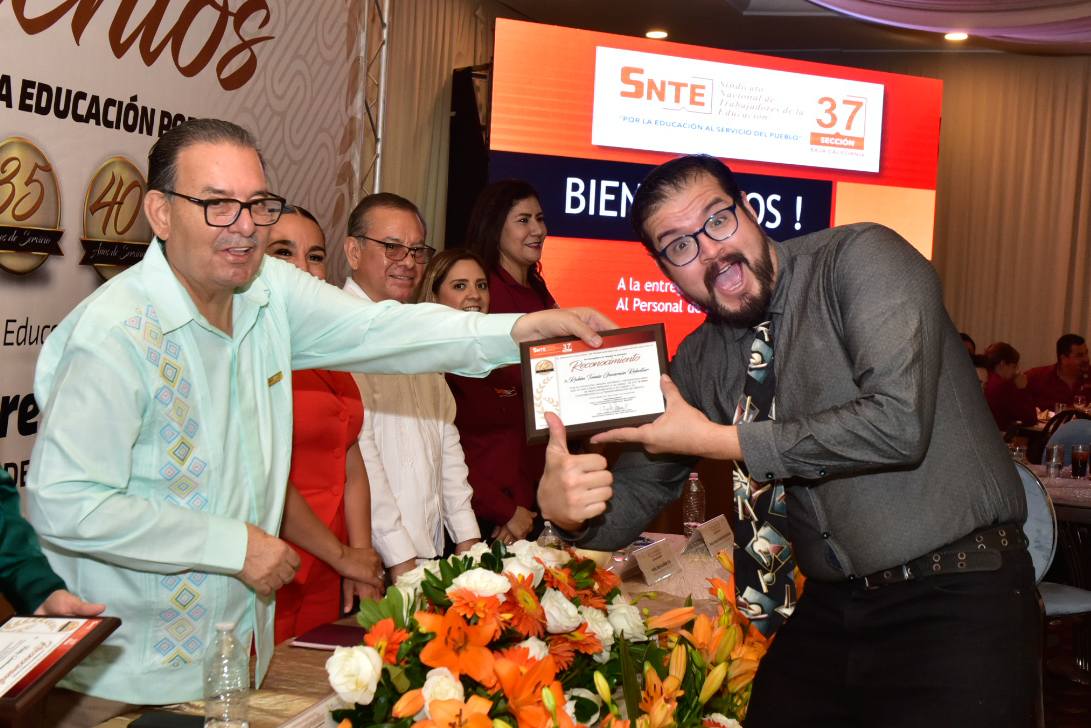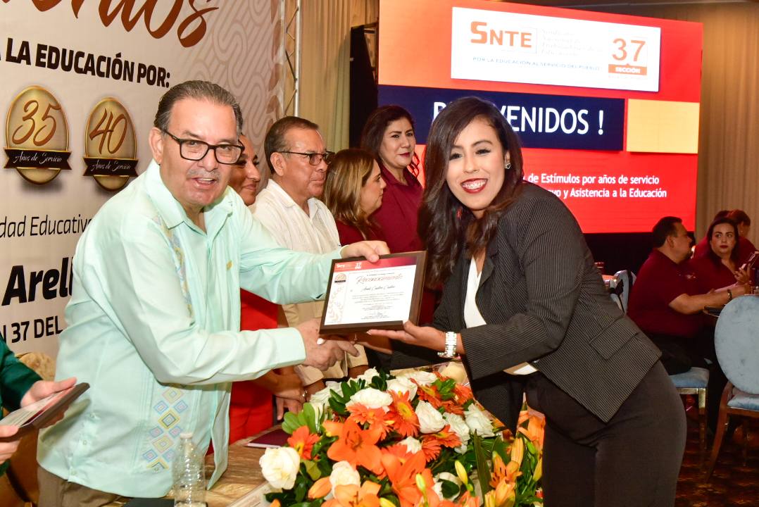 En un ambiente de alegría y compañerismo, el Profesor Ampelio Iñiguez Arellano, Secretario General de la Sección 37, encabezó la ceremonia de entrega de Reconocimientos y Estímulos a trabajadoras y trabajadores con más de 10, 15, 20, 25, 30, 35, 35 y 40 años de servicio.