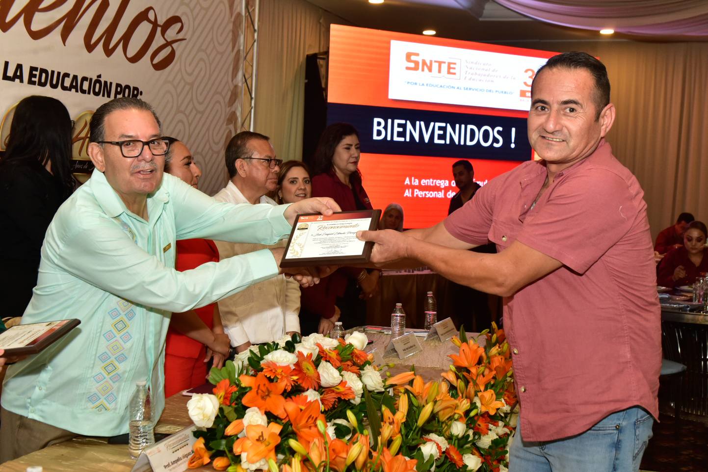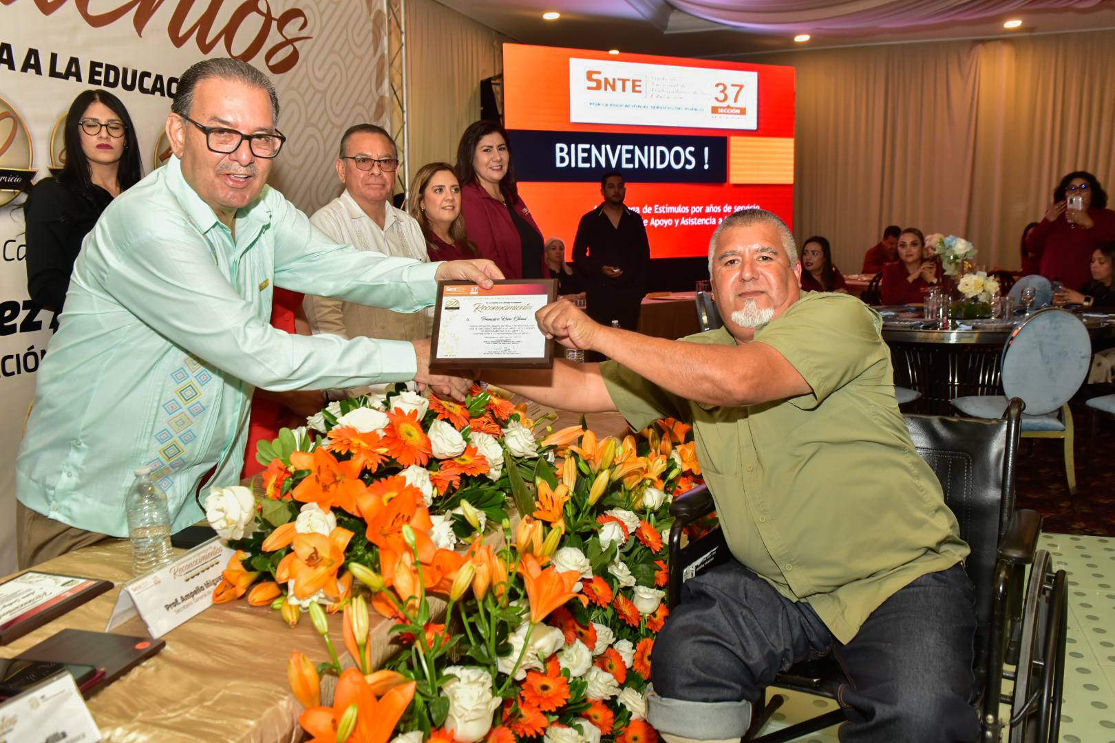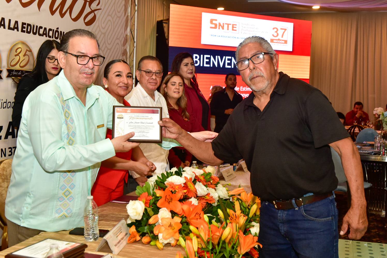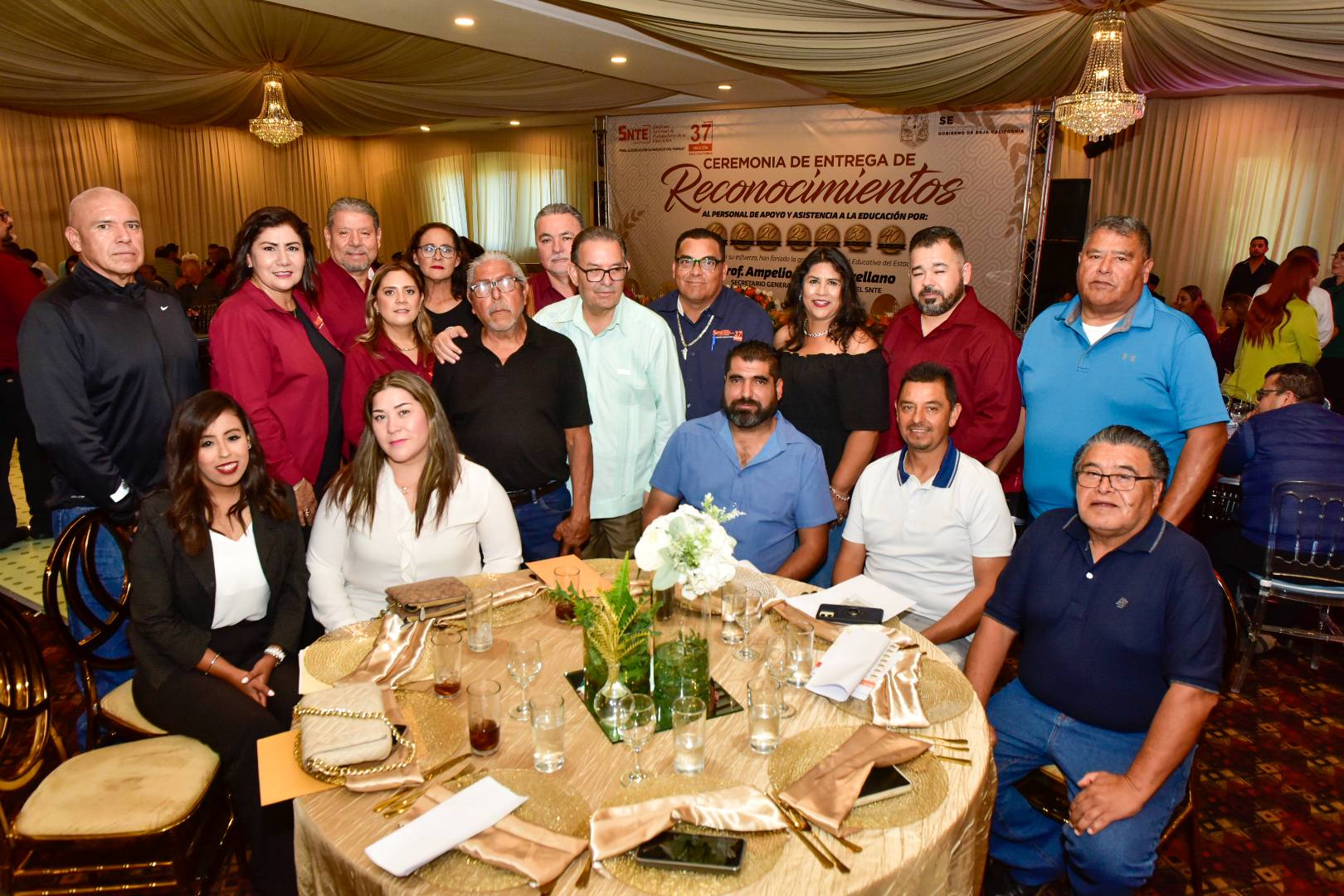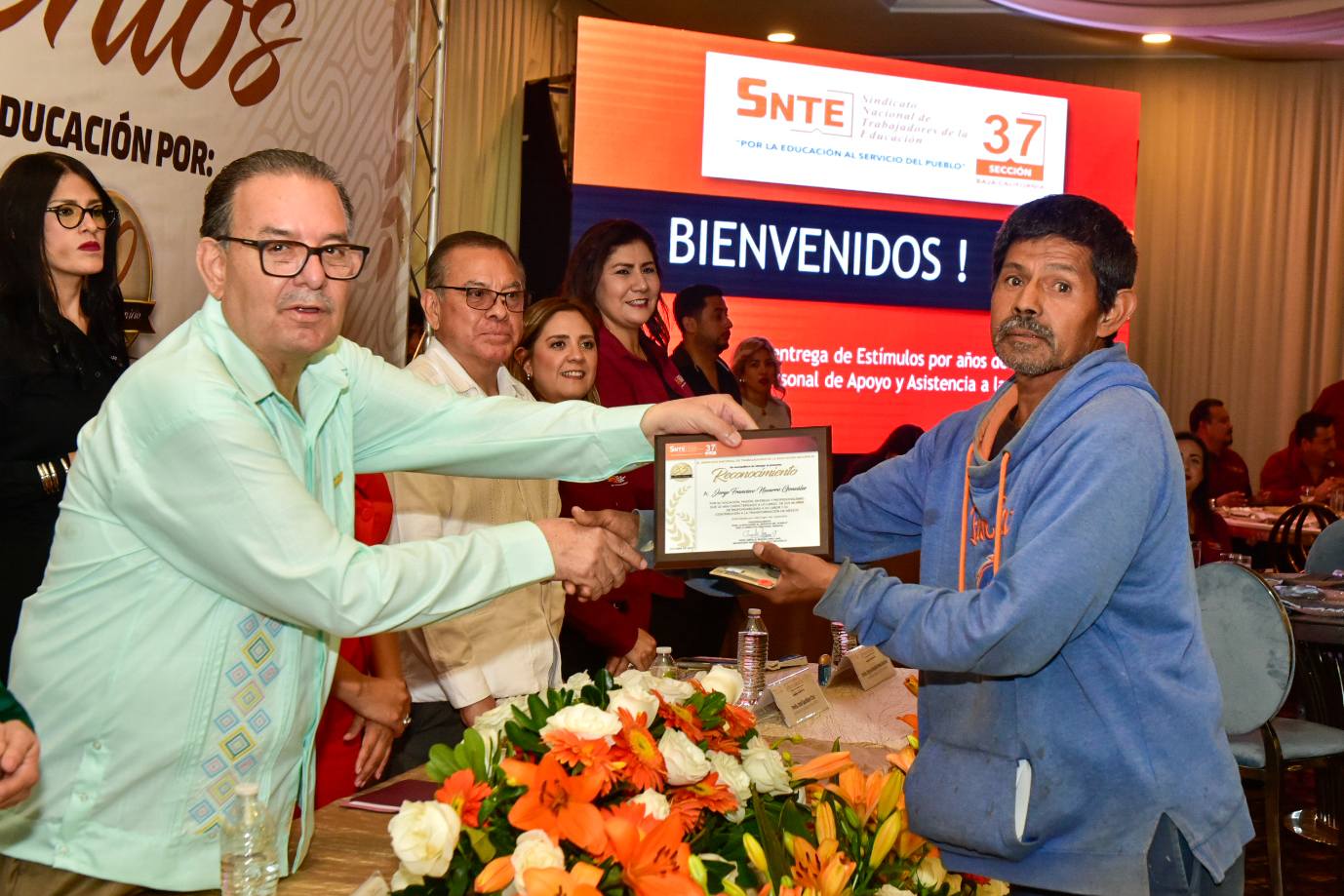En un ambiente de alegría y compañerismo, el Profesor Ampelio Iñiguez Arellano, Secretario General de la Sección 37, encabezó la ceremonia de entrega de Reconocimientos y Estímulos a trabajadoras y trabajadores con más de 10, 15, 20, 25, 30, 35, 35 y 40 años de servicio.