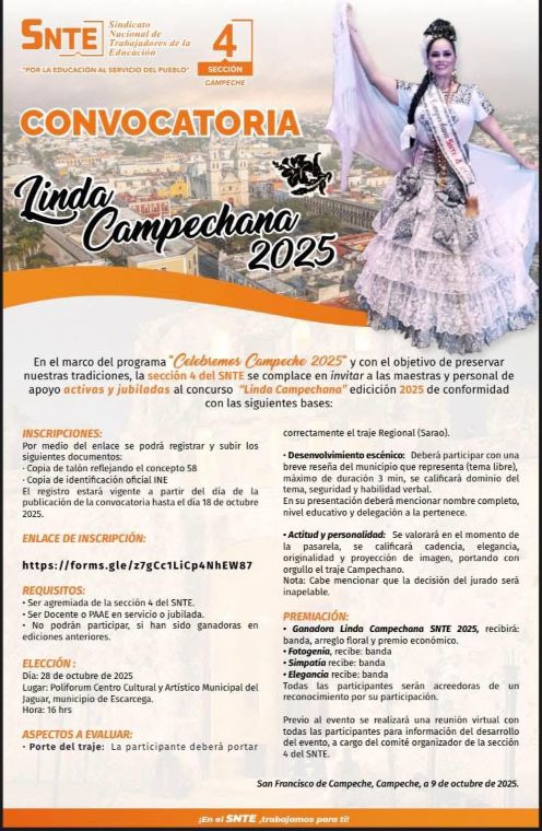 Con el propósito de impulsar el sentido de identidad con nuestras raíces y cultura, la sección 4 del SNTE les hace una atenta invitación a participar en el concurso de Linda Campechana SNTE 2025. Inscripción