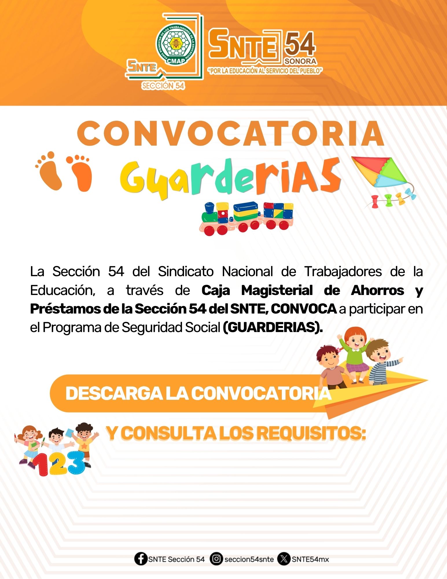 Convocatoria dirigida a las Trabajadoras y los Trabajadores de la Educación agremiados a la Sección 54 y Socios de CMAP, con el fin de apoyar a sus hijas e hijos, que se encuentren recibiendo servicios de desarrollo infantil en guarderías particulares, así como las subsidiadas por el Gobierno Federal y del Gobierno Estatal que representen un copago al Trabajador y, con fundamento en las Reglas de Operación del Programa de Seguridad Social.
